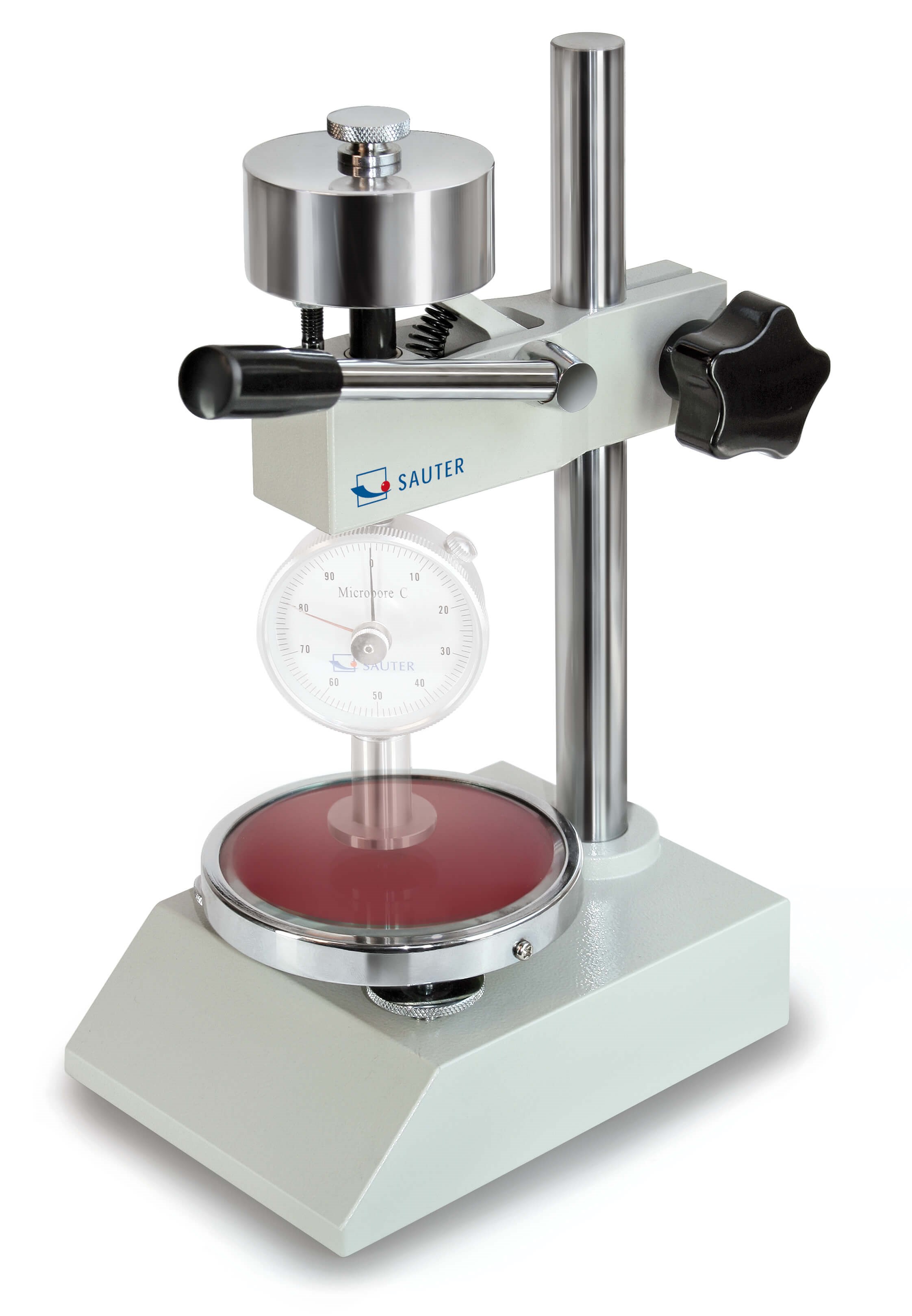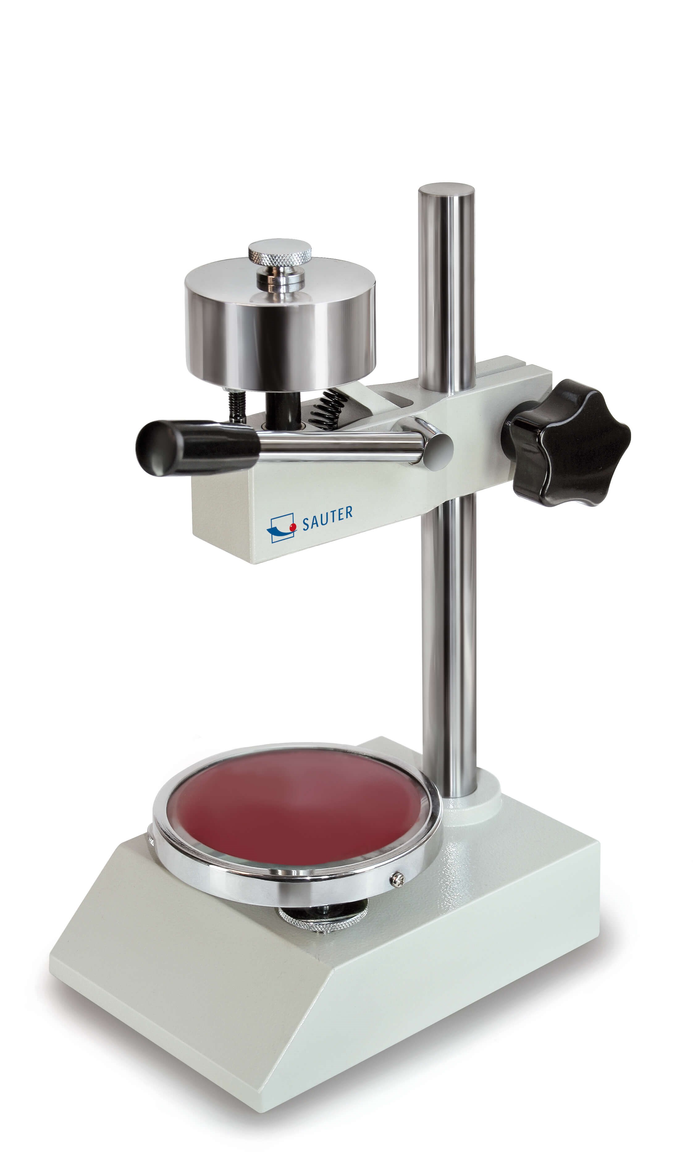 • For Shore hardness testing of plastics, leather etc. • Glass plate: Providing a higher base hardness and superior accuracy • Mechanical construction: Robust design for precise measuring • Level adjustment: For the precise levelling of the base plate blate • Adjustable base plate for the correction of inhomogeneous test objects • Operation: • 1. The SAUTER hardness testing device HB is fitted in a suspended position • 2. The test object is placed on the round testing table right under the durometer pin • 3. By lowering the handle lever, the measurement instrument is pressed in a controlled manner into the test object • The accuracy of the displayed result is approx. 25 % higher than in a manual operated test
