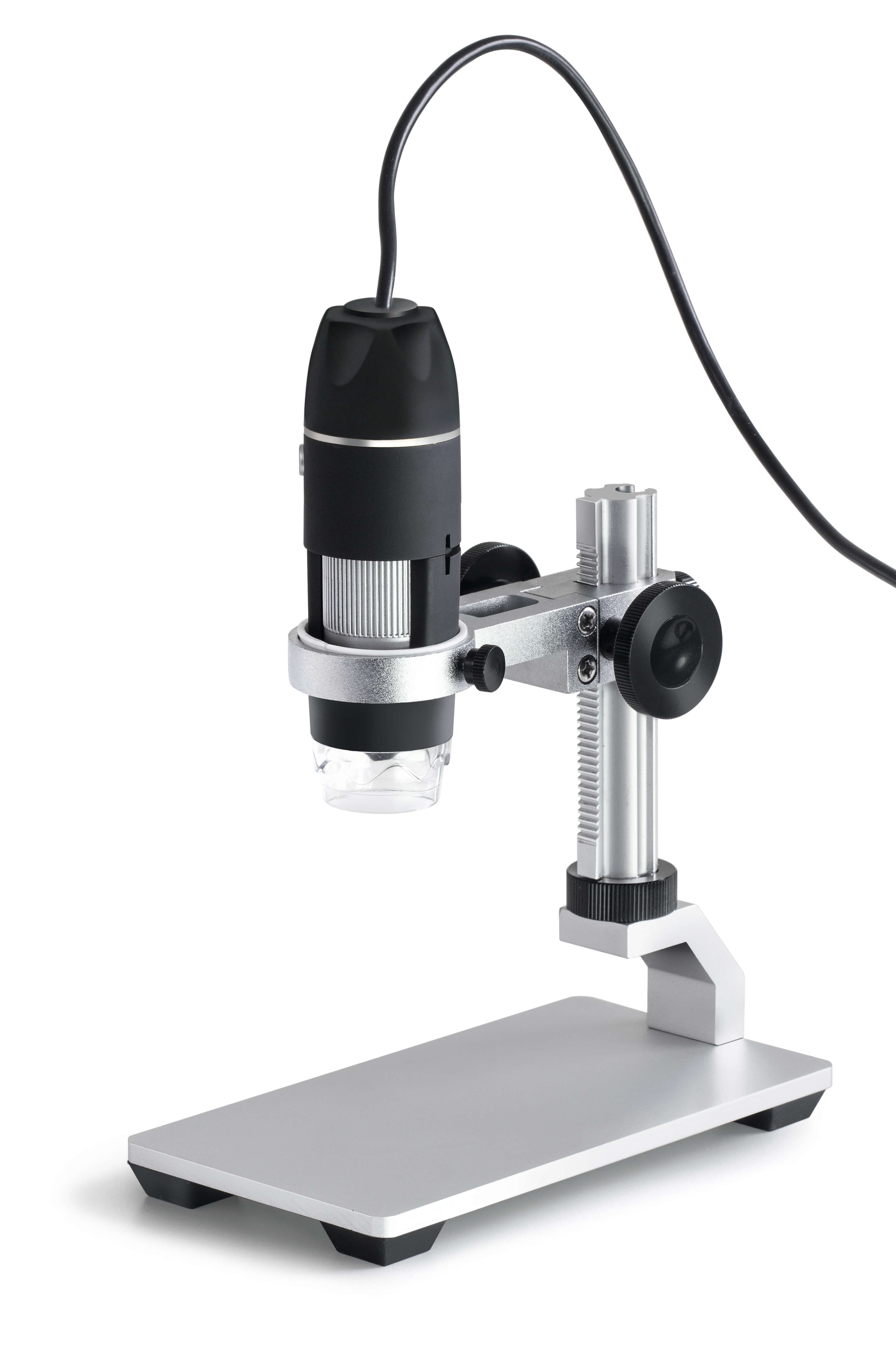 • The USB hand-held microscope is designed for rapid and simple observations. Ideally suited for coins, plants, insects and skin samples for all hobby scientists, children and students. • Le réglage simple du grandissement permet d'agrandir tous les échantillons habituels avec le microscope USB. La plage de zoom doit être mise au point sur un grandissement de 10x et 200x pour qu'une focalisation automatique ait lieu. • The eight LEDs fitted in the ring shape ensure strong and effective illumination of your sample. Use the adjustment wheel on the cable to control the illumination setting. • As well as the camera, you will also find a simplified version of our multi-lingual KERN Microscope VIS software included with delivery. • There are two stands available for you to use as a column. • cable length: 1,4 m