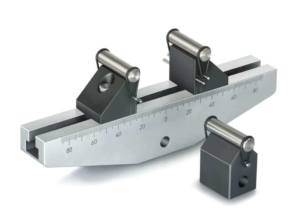 • central scale 80-0-80 mm • Consisting of one support beam, two support frames and a curved fin each with permanently fixed radii • radius of the fin 5 mm • radii of the support frames 5 + 10 mm • other radii on request • gap between the two support frames 4 - 150 mm • Width of the brackets 30 mm