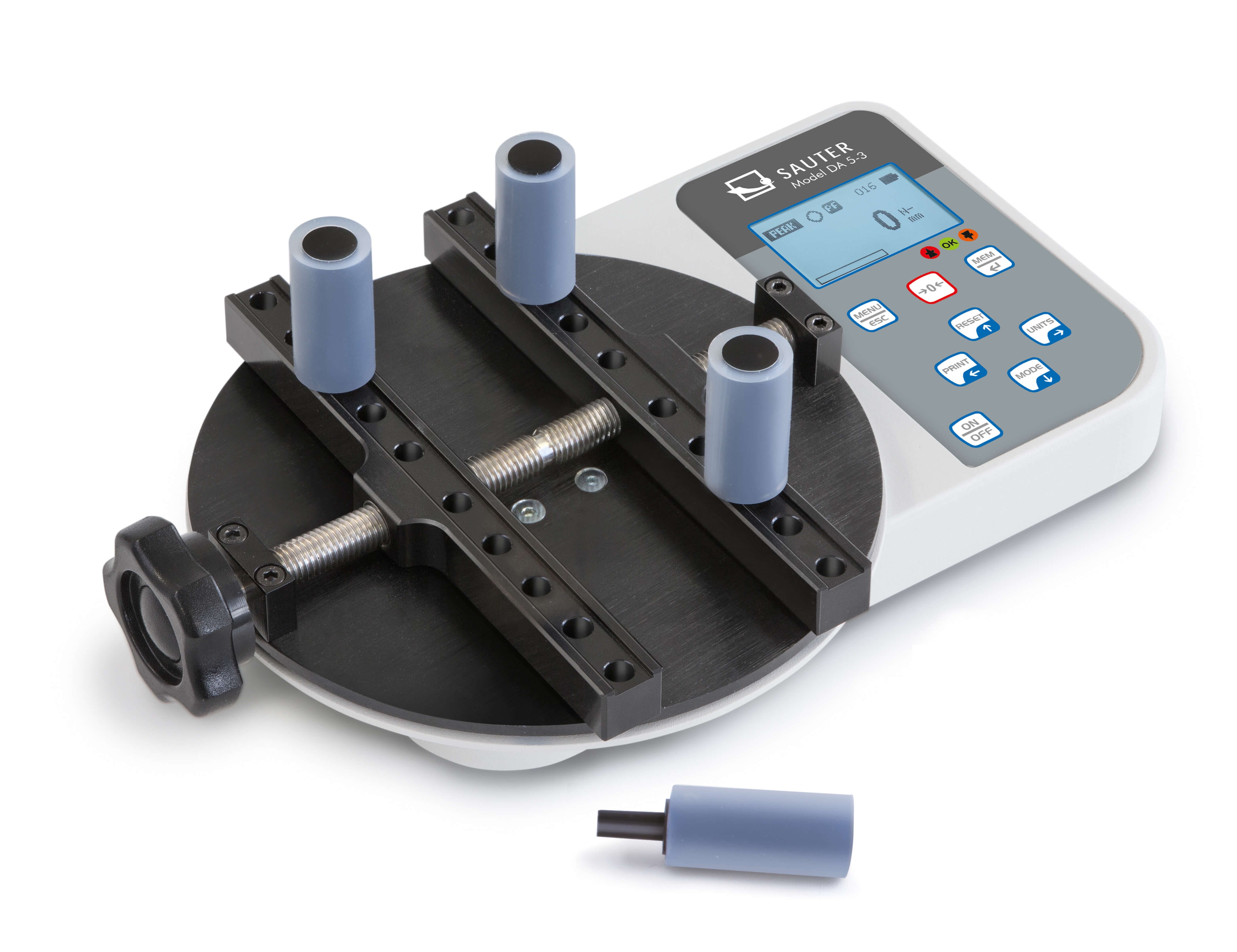 • Ideal for torque testing of bottles and other packaging with screw tops • Quick pin system: The four bottle mounts (holders) are pushed in, instead of being screwed in, to save time. This allows you to reconfigure quickly for other bottle sizes • Metal housing for durable usage in harsh environmental conditions • Capacity display: A bar lights up to show how much of the measuring range is still available • Back-lit LCD graphic display • num/1] Rubber feet with anti-slip feature • Scope of supply: four Quick Pins (bottle mounts) with rubber mantle, sturdy carry case • Internal data memory saves up to 500 measurements. The content of the memory can be transferred to the PC using optional software • Peak Hold Mode to capture peaks • Can be used in both directions of rotation • Function to set limits, programming of Max./Min., in pull and push direction, with output of audible and optical signal. Ideal mode for efficient and accurate testing of standard parts • AUTO-OFF function to preserve the battery