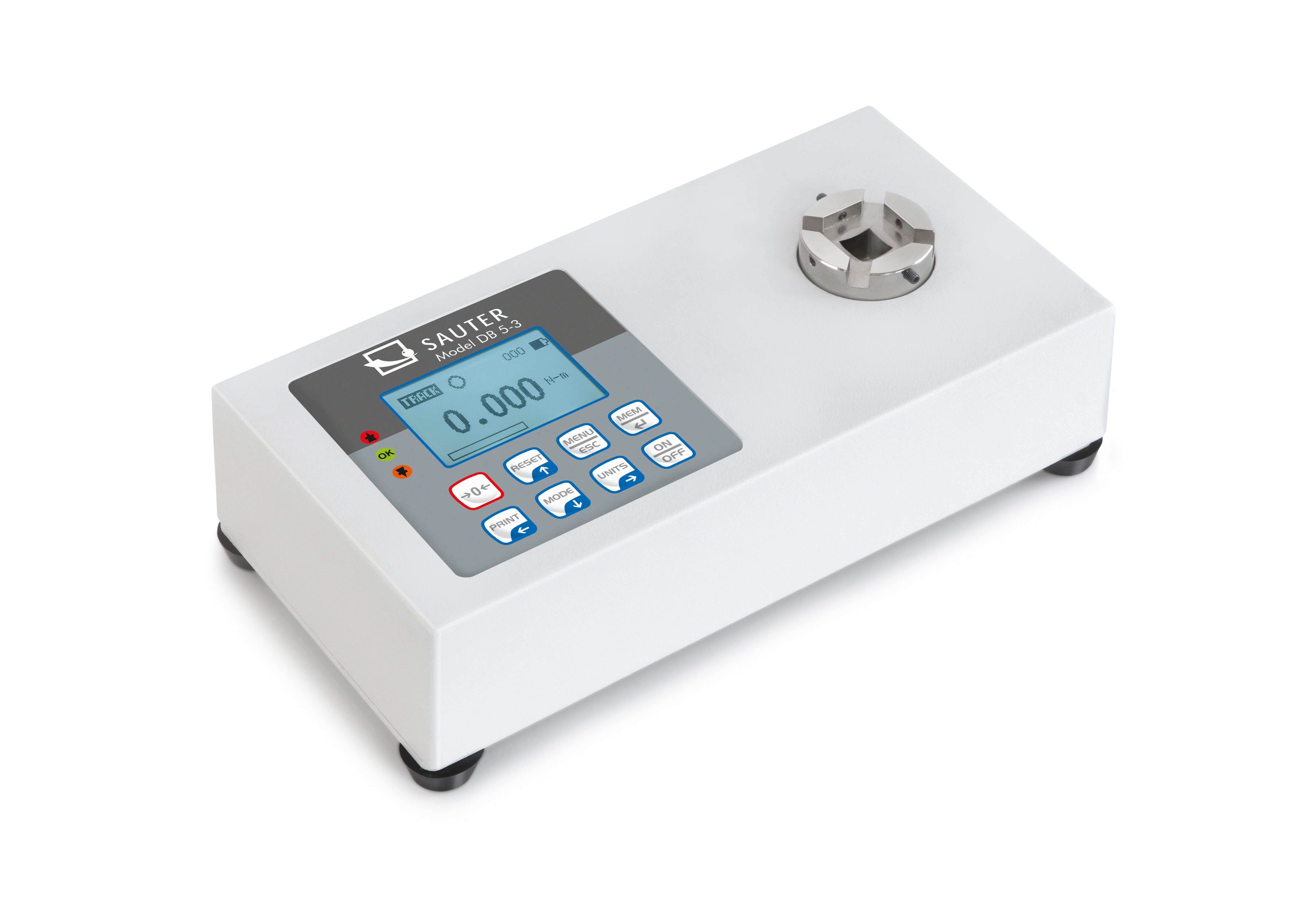 • Particularly suitable for testing torque wrenches, electric hand screwdrivers and cordless screwdrivers • Rotary sensor for dynamic testing of electric screwdrivers • Metal housing for durable usage in harsh environmental conditions • Capacity display: A bar lights up to show how much of the measuring range is still available • Back-lit LCD graphic display • num/1] Rubber feet with anti-slip feature with SAUTER DB 0.5-4 to DB 10-3 • Robust mounting plate for secure fixing with SAUTER DB 20-3 to DB 50-2 • Scope of supply: mounting plate, sturdy carry case • Internal data memory saves up to 500 measurements. The content of the memory can be transferred to the PC using optional software • Peak Hold Mode to capture peaks • Can be used in both directions of rotation • Function to set limits, programming of Max./Min., in pull and push direction, with output of audible and optical signal. Ideal mode for efficient and accurate testing of standard parts • AUTO-OFF function to preserve the battery