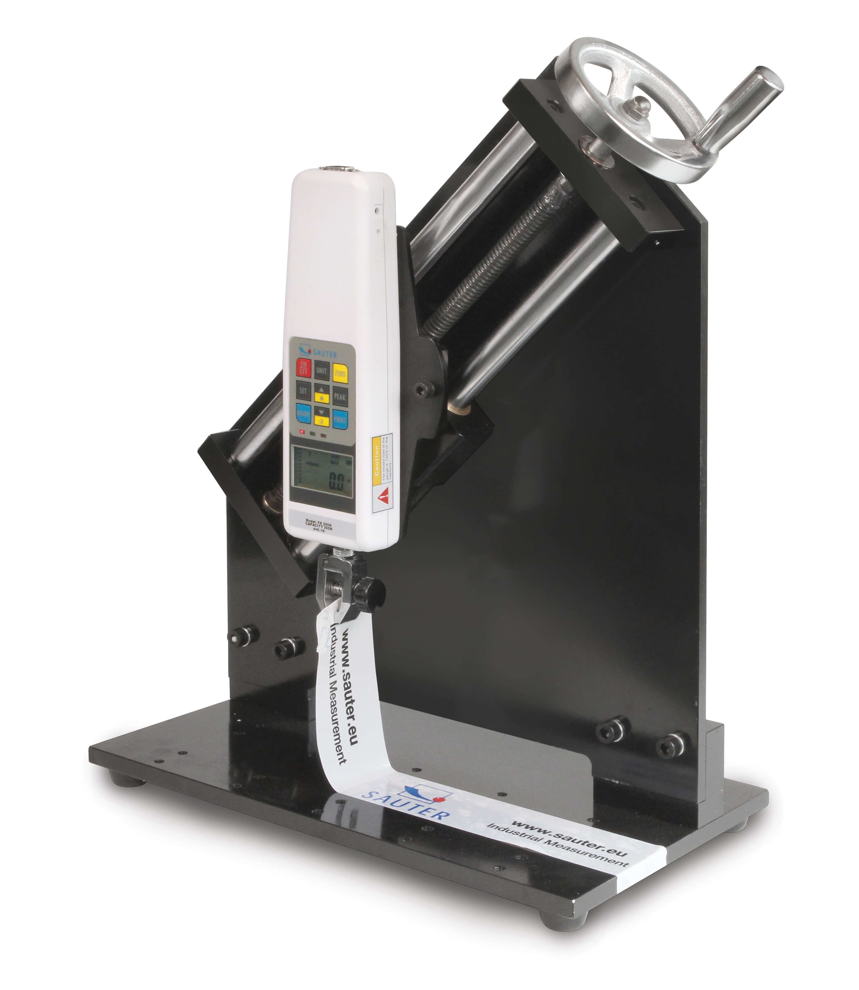 • The SAUTER test stand TPE has been developed specifically for peel testing. Typically this involves pulling a bonded material layer from a base material (see diagram) • Safe reliable operation due to the crank • As a general rule the significant value in this process is the force required to pull away the top layer from bonded material • The SAUTER TPE has been designed such that the force measuring unit exerting the force simultaneously moves sidewards and upwards. This means that a peel-off movement is produced, avoiding shear forces which could distort the result. • The test unit moves at an angle of 45° to the horizontal. The force-measurement device is fitted in an exact vertical position • Suitable for all SAUTER force-measuring devices up to 500 N (not included)Technical data • Travel distance per knob rotation (one stroke): 3,1 mm • Maximum stripping length: 105 mm • Overall dimensions W×D×H 420x215x480 mm • Net weight approx. 22 kg