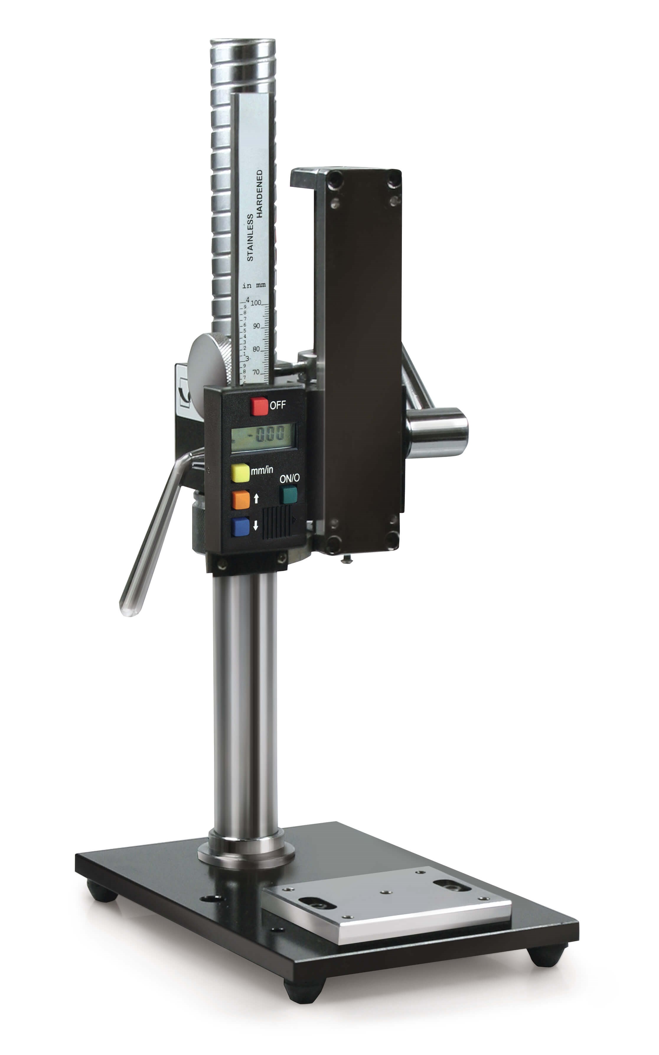 • Provides quick and consistent testing • High level of security with repeated measurements • Provides maximum versatility and precise measuring results • Slide construction for distance measurement • Large base plate with various holes for fixture mountings • Digital length meter • - measuring range: 0,01 mm • - Zero setting possible • - Pre-length can be set manually • Maximum carriage height above base plate: 318 mm • Max travel with one stroke: 78 mm