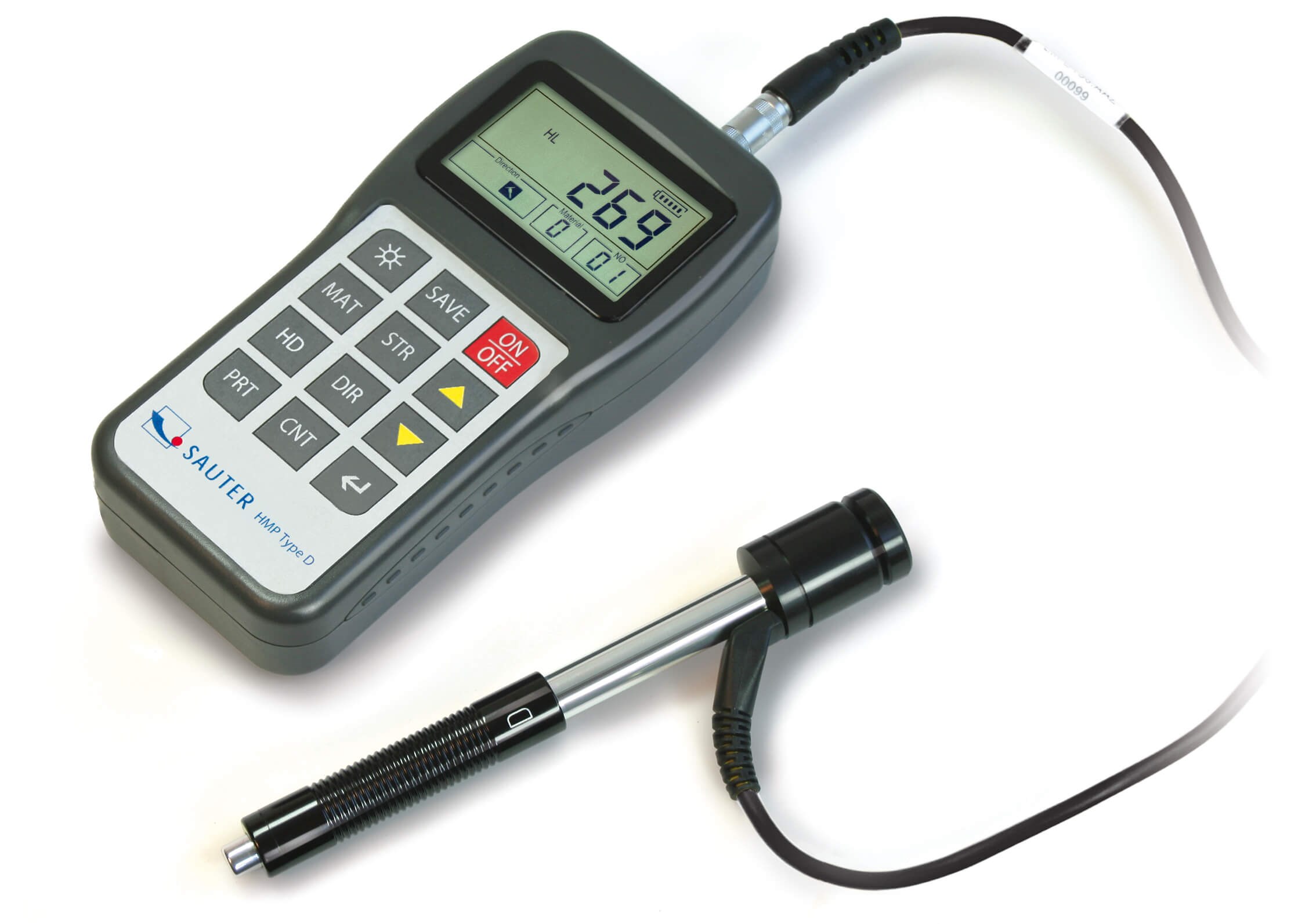 • Automatic recognition of the impact (rebound) sensor connected to the HMP. • Measures all metal samples (> 5 kg, thickness > 8 mm) • Mobility: In comparison with stationary table-top devices and testing devices with an internal sensor, using the SAUTER HMP. offers the highest level of mobility and flexibility • External impact sensor standard (Type D) • All measurement directions possible (360°) thanks to an automatic compensation function • Software and PC connection cable standard • Standard block for calibration with defnied HLD value standard • Support rings for bended testing samples available on request, • on request • Delivered in a hard carrying case • Internal memory for up to 100 data groups, with up to 32 values per group forming the average value of the group • Mini statistics function: displays the measured result, the average value, the impact direction, date and time • Measurement value display: Rockwell (B & C), Vickers (HV), Brinell (HB), Shore (HSD), Leeb (HL), tensile strength (MPa) • Automatic unit conversion: The measuring result is automatically converted into all specified hardness units • Precision: ± 1 % at 800 HLD • Measuring range tensile strength: 374 - 2652 MPa (steel) • Minimum sample radius (concave/convex): 50 mm (with support ring: 10 mm) • Min. sample weight on a solid and stable support: • Sensor C: 1,5 kg • Sensor D, DC, D+15, DL: 5 kg • Sensor G: 15 kg • Minimum sample thickness: • Sensor C: 1 mm • Sensor D, DC, D+15, DL: 8 mm • Sensor G: 10 mm