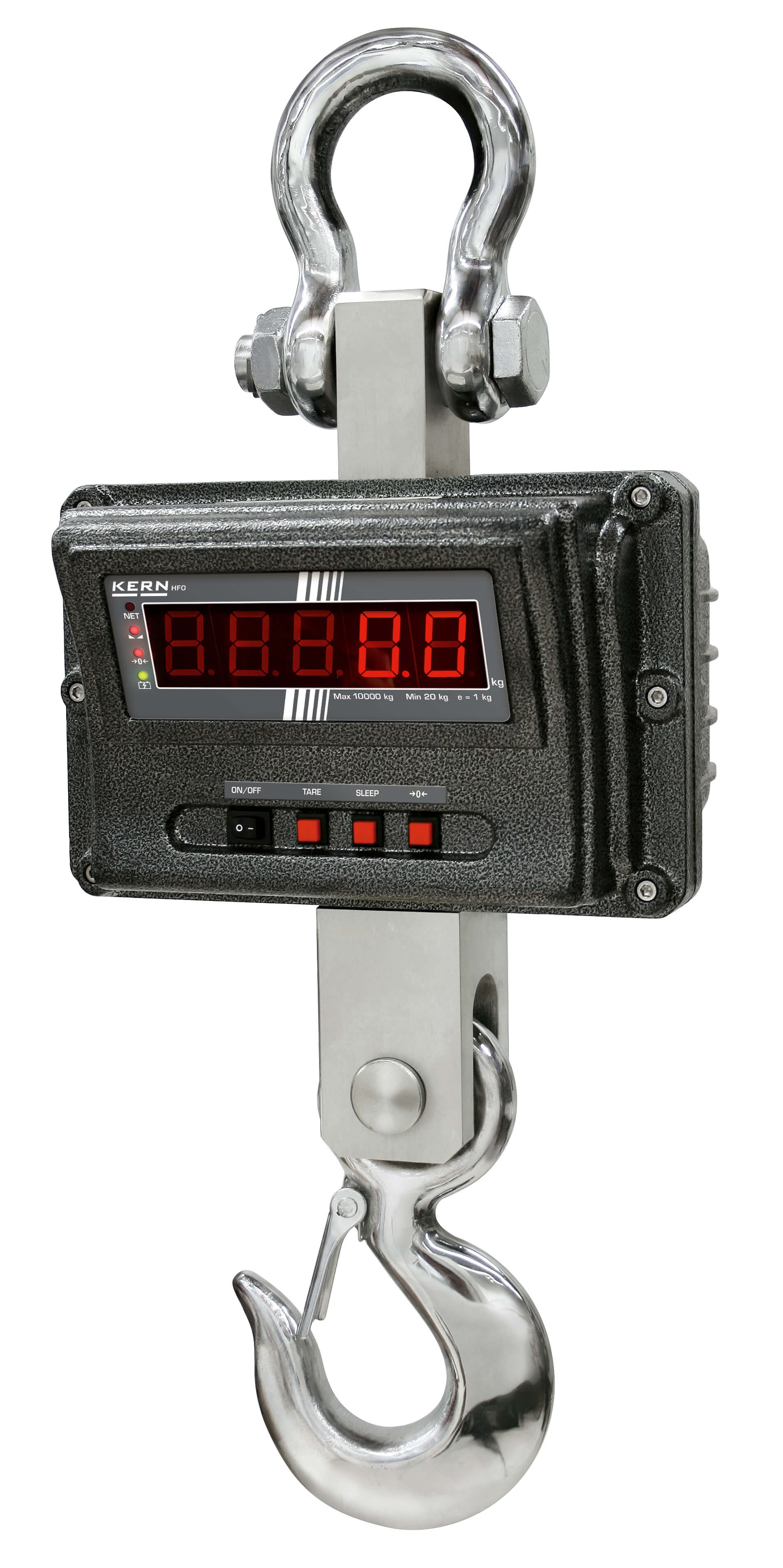 • With the TÜV certification mark, the scale meets the requirements of the standard EN 13155 (Non-fixed load lifting attachments/Breakage resistance) and EN 61010-1 (Electrical safety) • Professional device for robust applications in production, quality control, logistics etc. Because of its stable construction and robust design, it is ideal for continuous use in industrial applications • High mobility: thanks to battery operation, compact construction and low weight, it is suitable for use in several locations (production, warehouse, dispatch department etc.) • Hook with safety catch, revolving • Rechargeable battery pack internal, standard, operating time approx. 50 h, charging time approx. 14 h with mains adapter, charge indicator visual using LED • Adaptation to unstable environmental conditions by changing the readout • Hold function: When the weighing value remains unchanged the weight indicated on the display is automatically frozen until the HOLD key is pressed • Tare: Resets the display to 0 when there is a load on the scale. Now removed or added loads are directly displayed • Radio remote control standard. Range approx. 20 m. All functions can be selected (excl. ON/OFF). W×D×H 48x10x95 mm. Batteries included, 2 x 1,5 V AAA