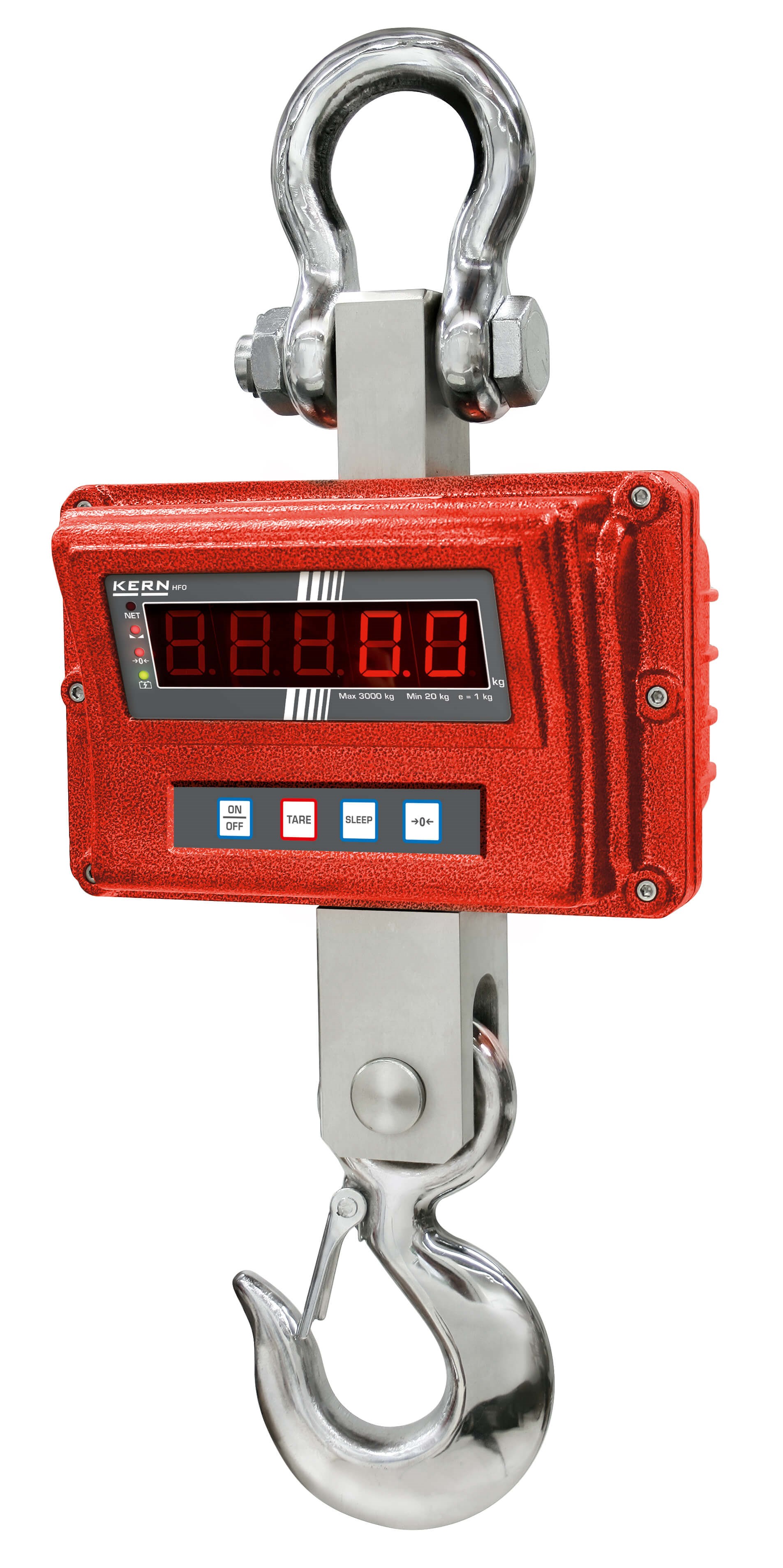 • With the TÜV certification mark, the scale meets the requirements of the standard EN 13155 (Non-fixed load lifting attachments/Breakage resistance) and EN 61010-1 (Electrical safety) • Professional device for robust applications in production, quality control, logistics etc. • Because of its stable construction and robust design, it is ideal for continuous use in industrial environment • High mobility: thanks to battery operation, compact construction and low weight, it is suitable for use in several locations (production, warehouse, dispatch department etc.) • Adaptation to unstable environmental conditions by changing the readability • High resolution readout: Read-out for 5 sec increased by one decimal place at the touch of a key, only for models with EC type approval • Hold function: When the weighing value remains unchanged the weight indicated on the display is automatically frozen until the HOLD key is pressed • Tare: Resets the display to 0 when there is a load on the scale. Now removed or added loads are directly displayed • Hook with safety catch, revolving