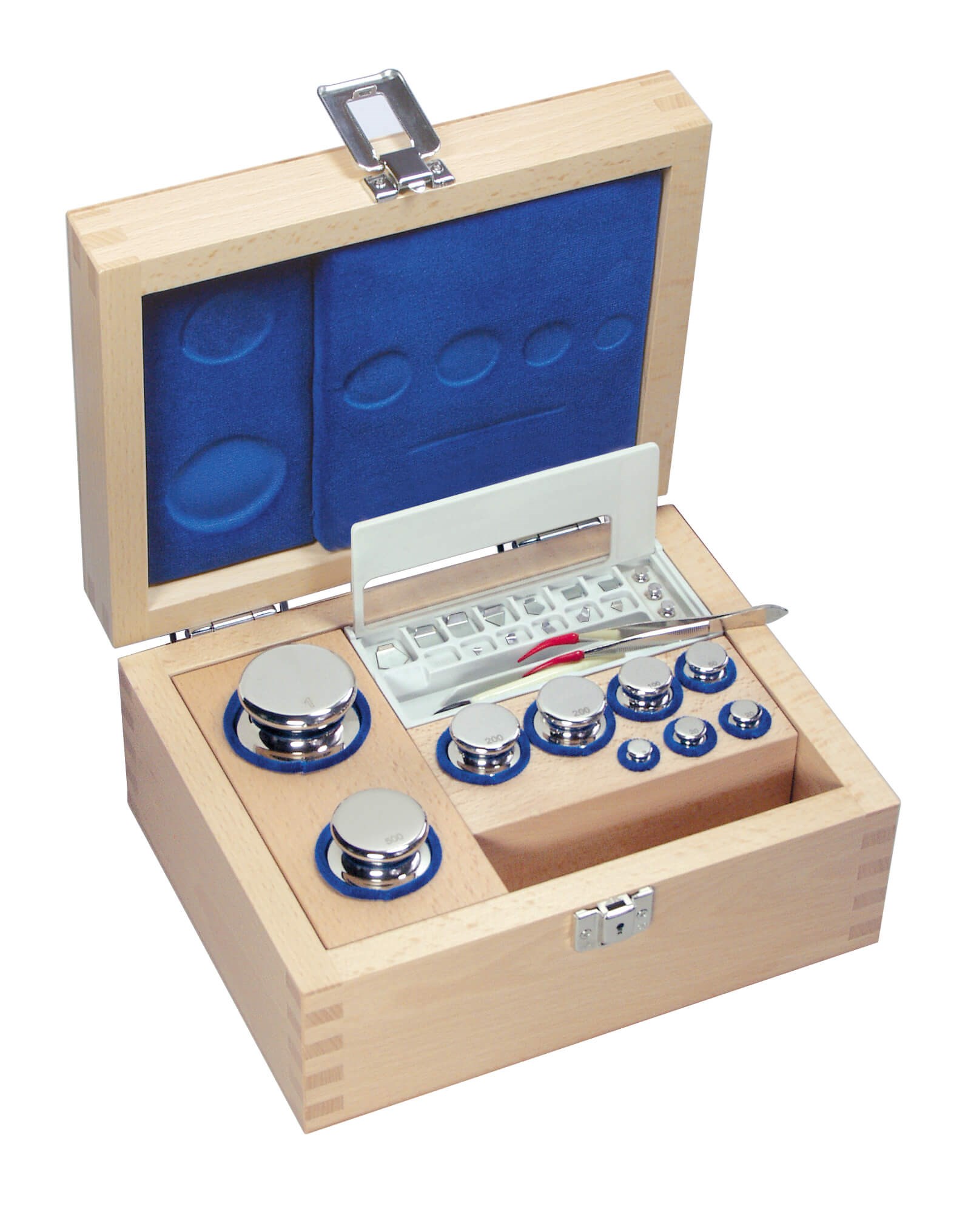 • Material adjusting weight: Individual weights polished stainless steel, Milligram weights german silver • Material case: Lined wood. Milligram weights (1 mg - 500 mg) in removable plastic box • The smallest and the largest weight is specified in the table at any one timeNote: If weights are shipped without a protective box, it is highly likely that the weights will be damaged. This damage may mean the weights exceed the permissible error limits. In the worst case, this may render your weights unusable. We can therefore provide you with the appropriate boxes for protection and storage, which prevent damage and will allow you to store your weights securely throughout their service life. However, should you still wish to have your weights shipped without such a protective box, then you must confirm this to KERN in writing.