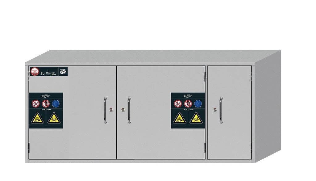 Kemikaalikaappi aggressiivisten, palamattomien aineiden varastointiin työtiloissa EN 14727 mukaan, pöydänalusmalli. Ulkomitat 1400 x 570 x 600 mm (LxSxK). Irrotettavat vetohyllyt muovisella valuma-altaalla.