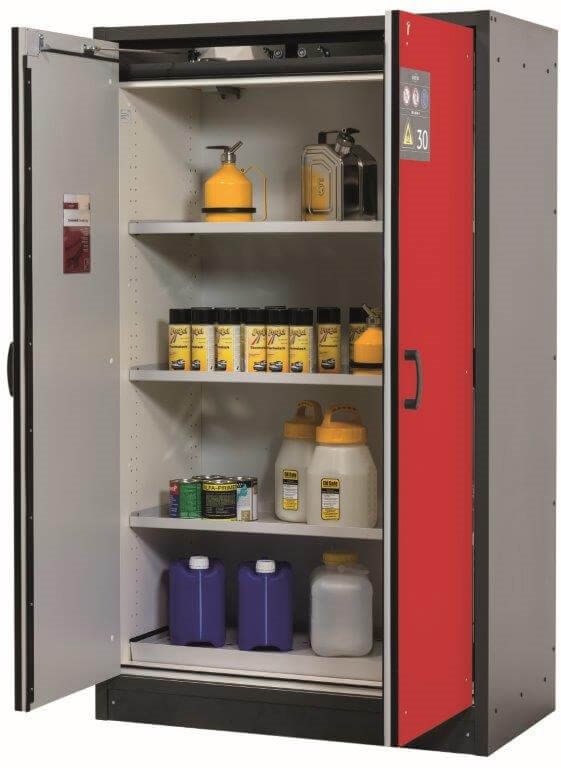 EN 14470-1 mukainen paloturvakaappi 30 min. palonsuojauksella, syttyvien vaarallisten aineiden varastointiin työtiloissa. Ulkomitat 1164 x 620 x 1947 mm (LxSxK). Vakiovarusteena 3 hyllyä ja pohja-allas, optiona lisähylly. Saatavana myös vetolaatikoilla.