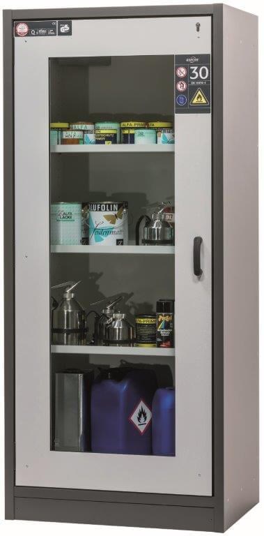 EN 14470-1 mukainen lasiovellinen paloturvakaappi 30 min. palonsuojauksella, syttyvien vaarallisten aineiden varastointiin työtiloissa. Ulkomitat 864 x 620 x 1947 mm (LxSxK). Vakiovarusteena 3 kinteää hyllyä ja pohja-allas / 4 tai 6 vetohyllyä.