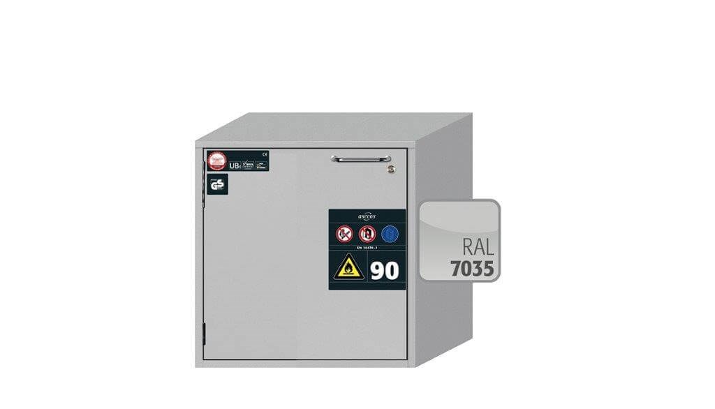 EN 14470-1 mukainen paloturvakaappi 90 min. palonsuojauksella, sijoitus tason alle, helposti syttyvien vaarallisten aineiden varastointiin työtiloissa. Ulkomitat 593 x 574 x 600 mm (LxSxK). Vakiovarusteena vetolaatikko ja pohja-allas. Saatavana myös 502 mm syvyydellä.