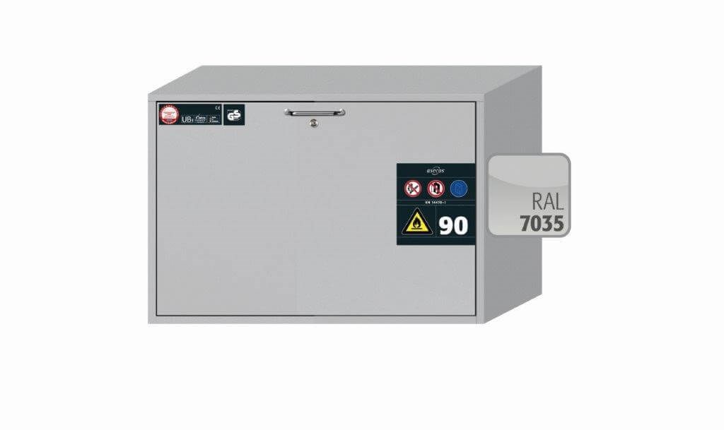 EN 14470-1 mukainen paloturvakaappi 90 min. palonsuojauksella, sijoitus tason alle, helposti syttyvien vaarallisten aineiden varastointiin työtiloissa. Ulkomitat 893 x 574 x 600 mm (LxSxK). Vakiovarusteena perforoitu säilytystaso ja pohja-allas. Saatavana myös 502 mm syvyydellä.