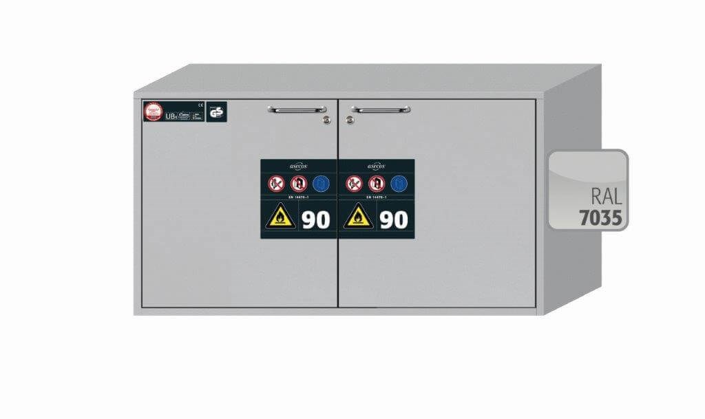 EN 14470-1 mukainen paloturvakaappi 90 min. palonsuojauksella, sijoitus tason alle, helposti syttyvien vaarallisten aineiden varastointiin työtiloissa. Ulkomitat 1102 x 574 x 600 mm (LxSxK). Vakiovarusteena kaksi vetolaatikkoa ja kaksi perferoitua säilytystasoa. Saatavana myös 502 mm syvyydellä.