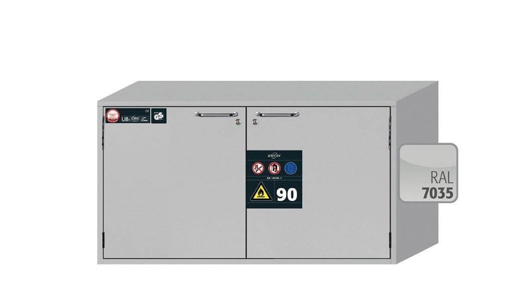 EN 14470-1 mukainen paloturvakaappi 90 min. palonsuojauksella, sijoitus tason alle, helposti syttyvien vaarallisten aineiden varastointiin työtiloissa. Ulkomitat 1102 x 574 x 600 mm (LxSxK). Vakiovarusteena perferoitu säilytystaso ja pohja-allas.. Saatavana myös 502 mm syvyydellä.