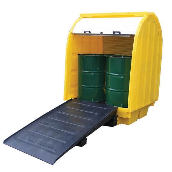 Säilytyskaappi neljälle 200 l tynnyrille, rullaovella, PE-muovia. Ulkomitat 1470 x 1420 x 2070 (LxSxK), pohjalla valuma-allas 410 litraa. Kantavuus yhteensä 1250 kg.