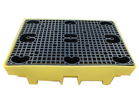 PE-valuma-allas kahdelle 200 litran tynnyrille, vetoisuus 240 litraa, muoviritilä. Ulkomitat 1220 x 820 x 330 mm (L x S xK), kantavuus 650 kg, haarukkatrukilla tai pumppukärryllä siirrettävissä.