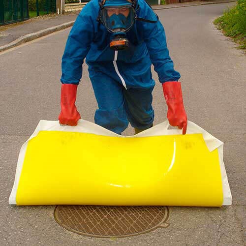 Kudosvahvistettu kaivonsulkumatto, alapuoli liimautuva muovisekoite. Veden, öljyn ja useita kemikaaleja kestävä. Koko 900 x 900 mm