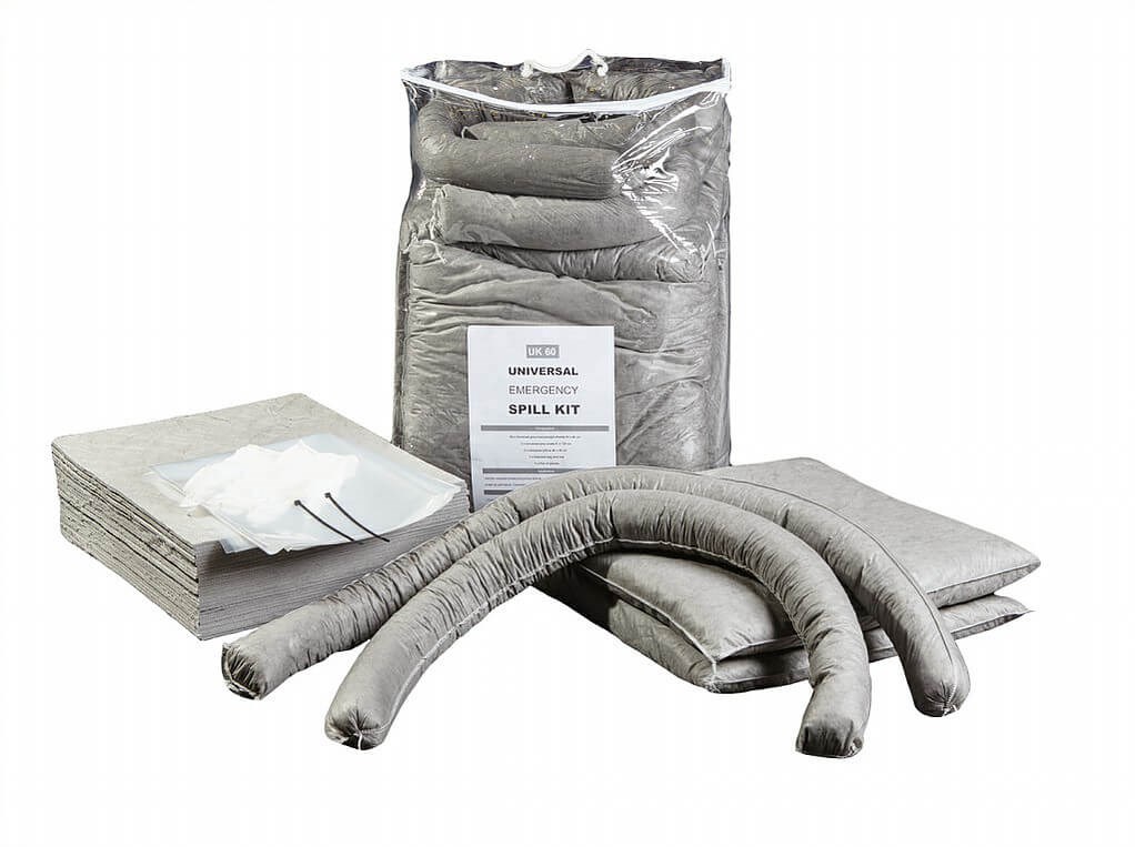 Imeytyspakkaus (70x50x30 cm) yleiskäyttöön, sisältää: 30 kpl paksuja Universal arkkeja (40 x 50 cm), 2 kpl imeytyspuomia 8 x 120 cm, 2 kpl imeytystyynyjä (46x46 cm), jätesäkin ja kertakäyttöhanskat. Imukyky 60 litraa.